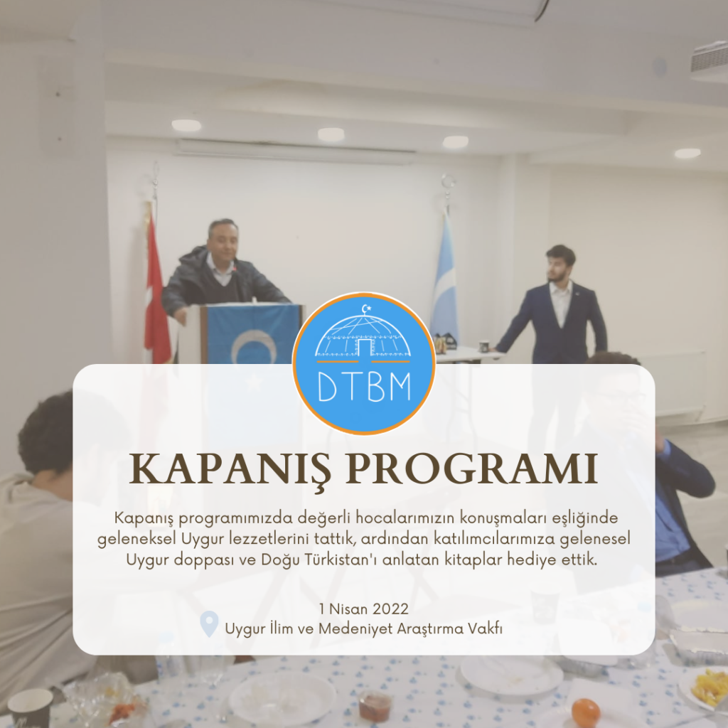 DTBM ekibi olarak 2021 yılı Şubat ayında ilk kez Doğu Türkistan Akademisini gerçekleştirdik. Programımız bir açılış ve bir kapanış programı olmak üzere toplam 6 hafta sürdü. Açılışta Amerika vatandaşı Uygur aktivist Abdülhakim İdris, Yetim Vakfı Başkanı Murat Yılmaz, Uluslararası Doğu Türkistan STK’lar Birliği başkanı Hidayet Oğuzhan ve Tarihçi-Yazar ayrıca mentor hocamız Abdullah Oğuz Beyler konuşmalarını kıymetli dinleyicilere sundular.