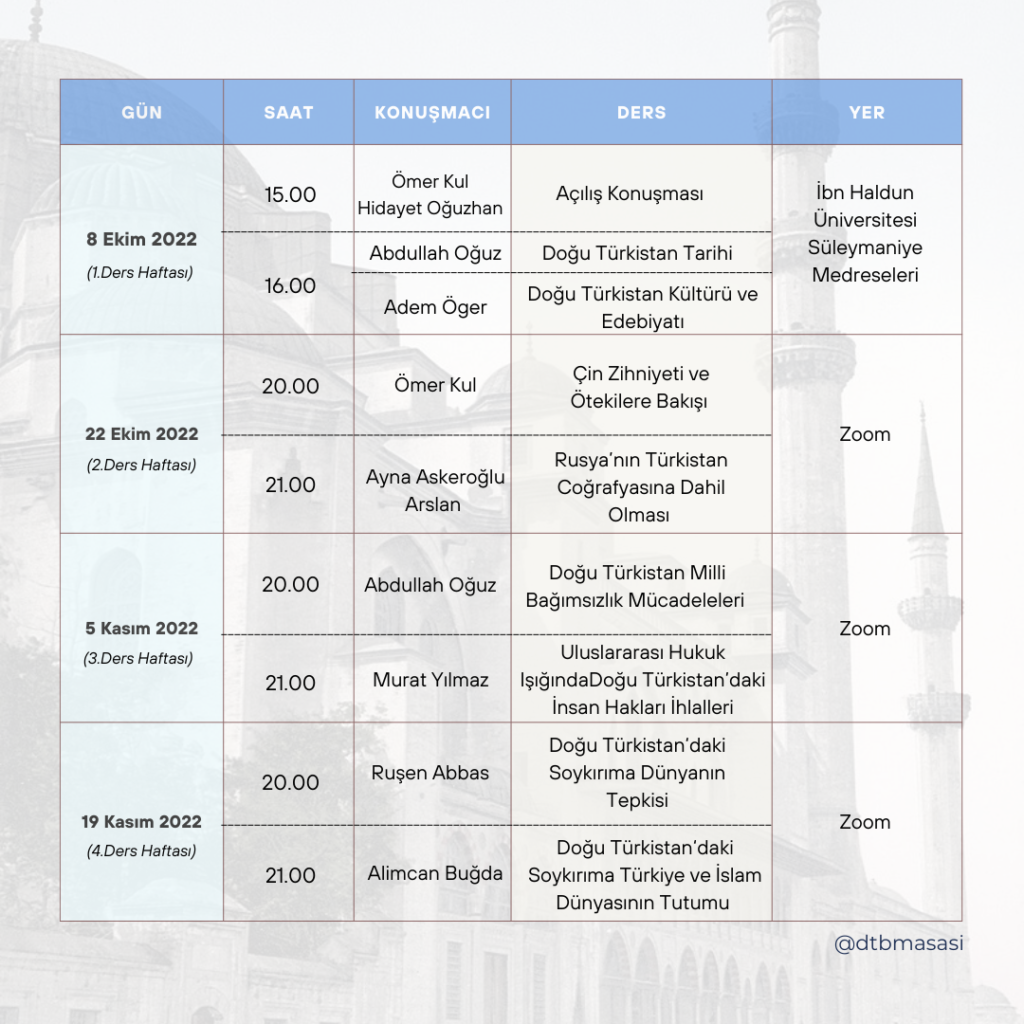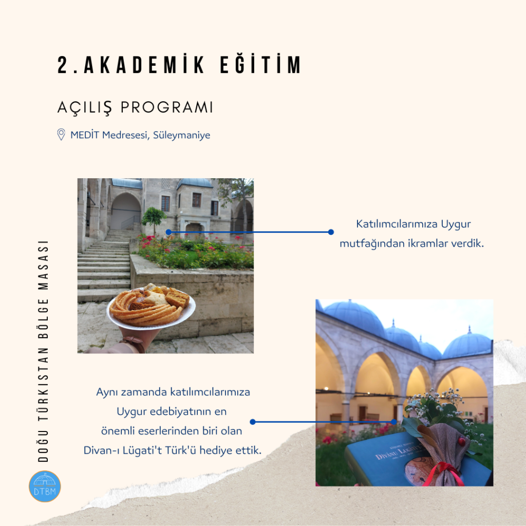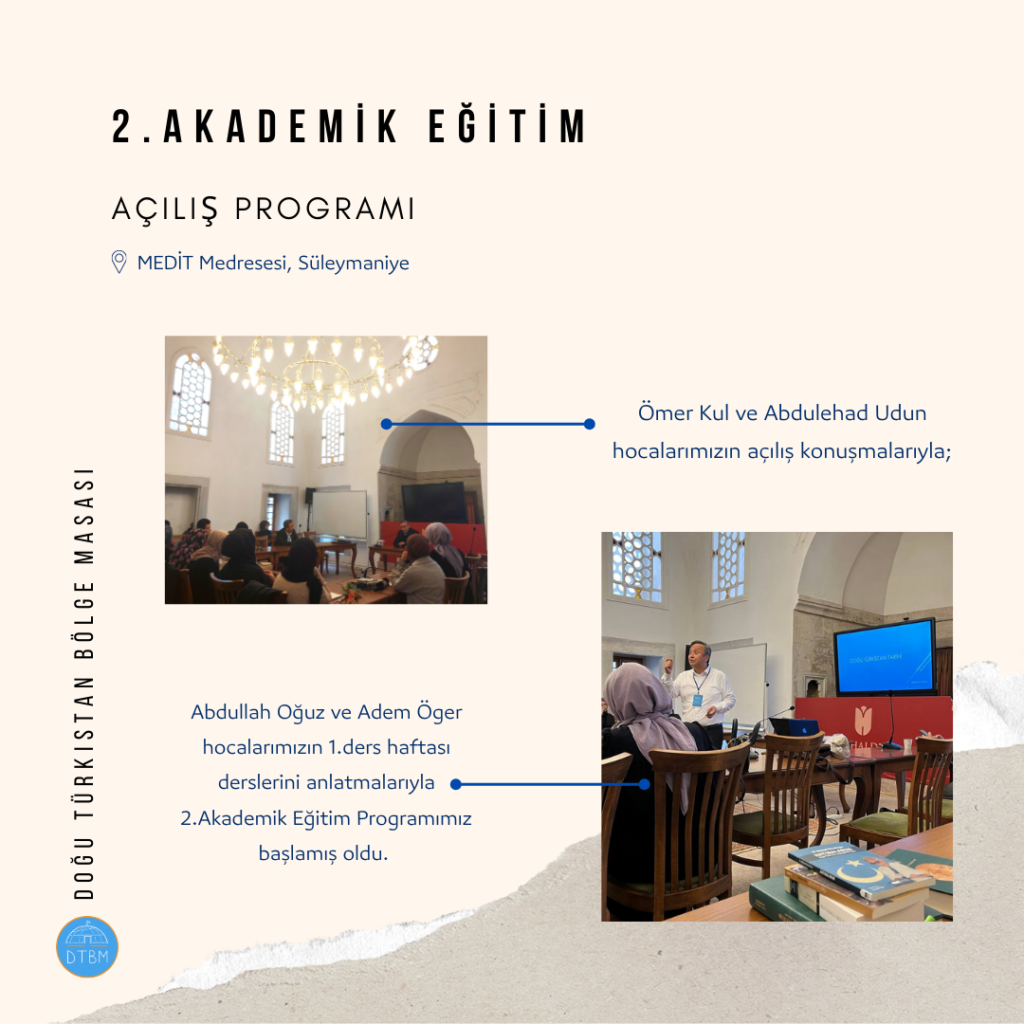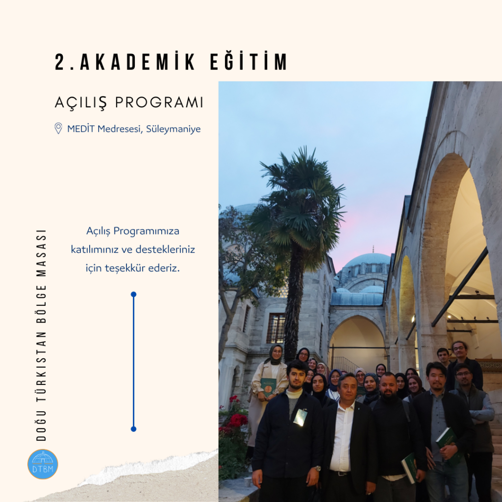 Doğu Türkistan Bölge Masası olarak gerçekleştirdiğimiz ikinci akademimizde 4 ders 4 ödev haftası olarak sekiz haftalık bir müfredat izledik. Bu eğitim yılımızda da yine bir çok disiplini uzman hocalar ile ele aldık. Akademimiz online gerçekleşmiş ve Türkiyenin 20 farklı şehrinden 35 katılımcı ile eğitim programımız gerçekleşmiştir.