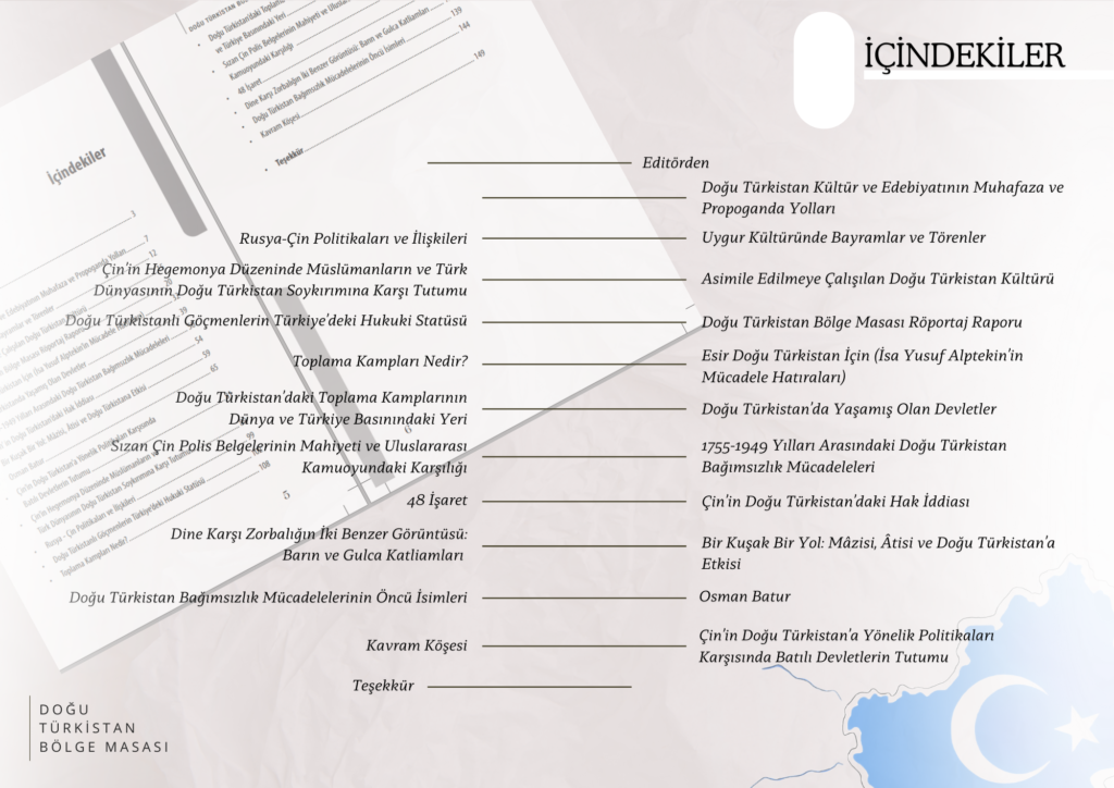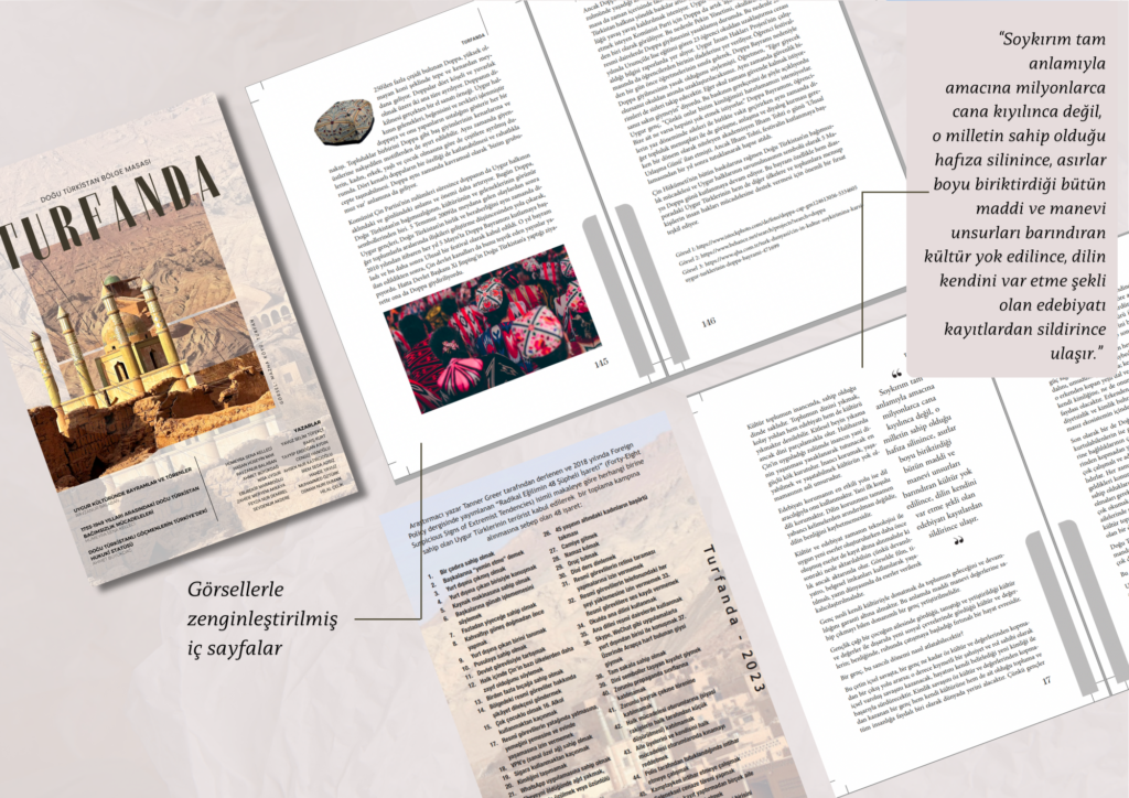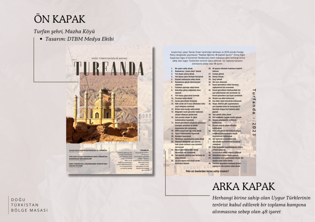 Doğu Türkistan Bölge Masası olarak Turfanda dergimizi gururla sunuyoruz. Yönetim kurulumuz tamamen öğrenci üyelerden oluşmaktadır ve Doğu Türkistan meselesindeki akademik faaliyetsizliği gidermek amacıyla iki yıldır özveriyle çalışıyoruz. Dergimiz, eğitim programlarımızı başarıyla tamamlayan kuriyerlerimizin ve yönetim kurulu üyelerimizin yazılarından oluşmaktadır. Amacımız, Doğu Türkistan davasını geniş kitlelere ulaştırmak ve bu alanda öncü olan Mehmet Emin Buğra ile İsa Yusuf Alptekin’in izinden gitmektir. Turfanda ismi, genç yüreklerin meseleyi taze bir bakış açısıyla ele almasını ifade ederken, aynı zamanda Doğu Türkistan’ın Turfan iline de atıfta bulunmaktadır.